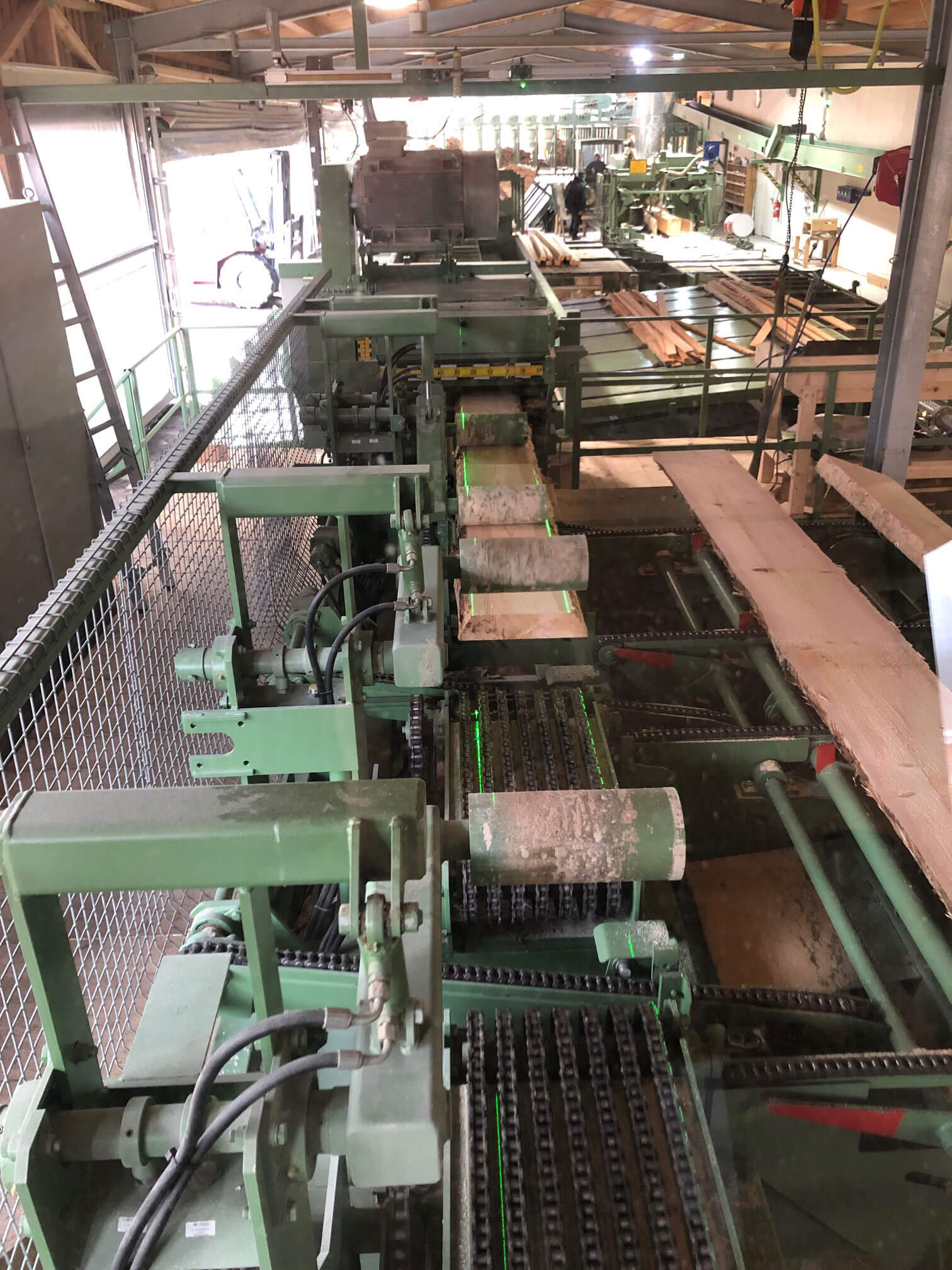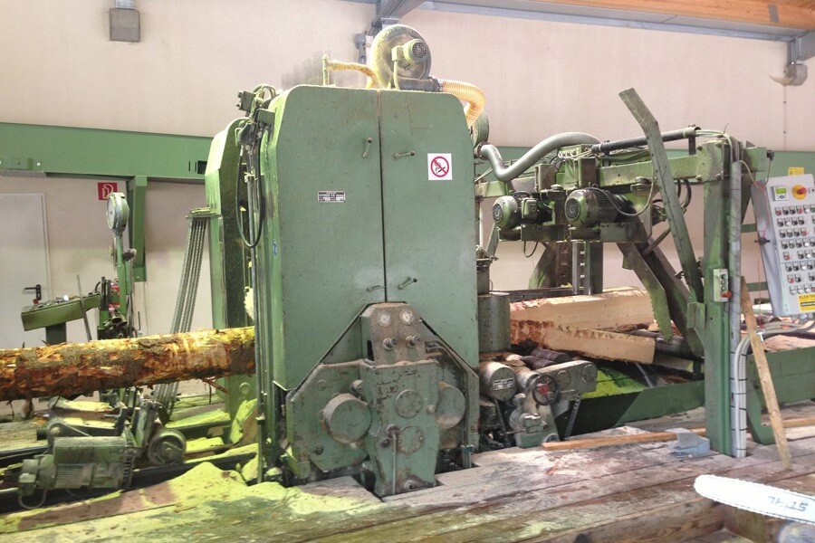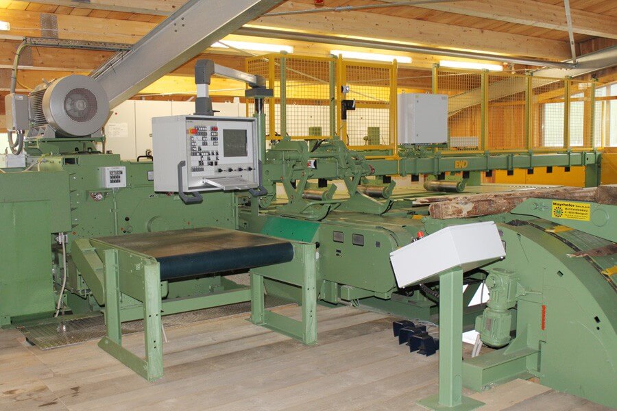Bretter und Model werden von einem vollautomatischen Besäumer der Marke Esterer Combimes DK 90 aufgetrennt und wertoptimiert besäumt. Maximale Schnitthöhe 160 mm.