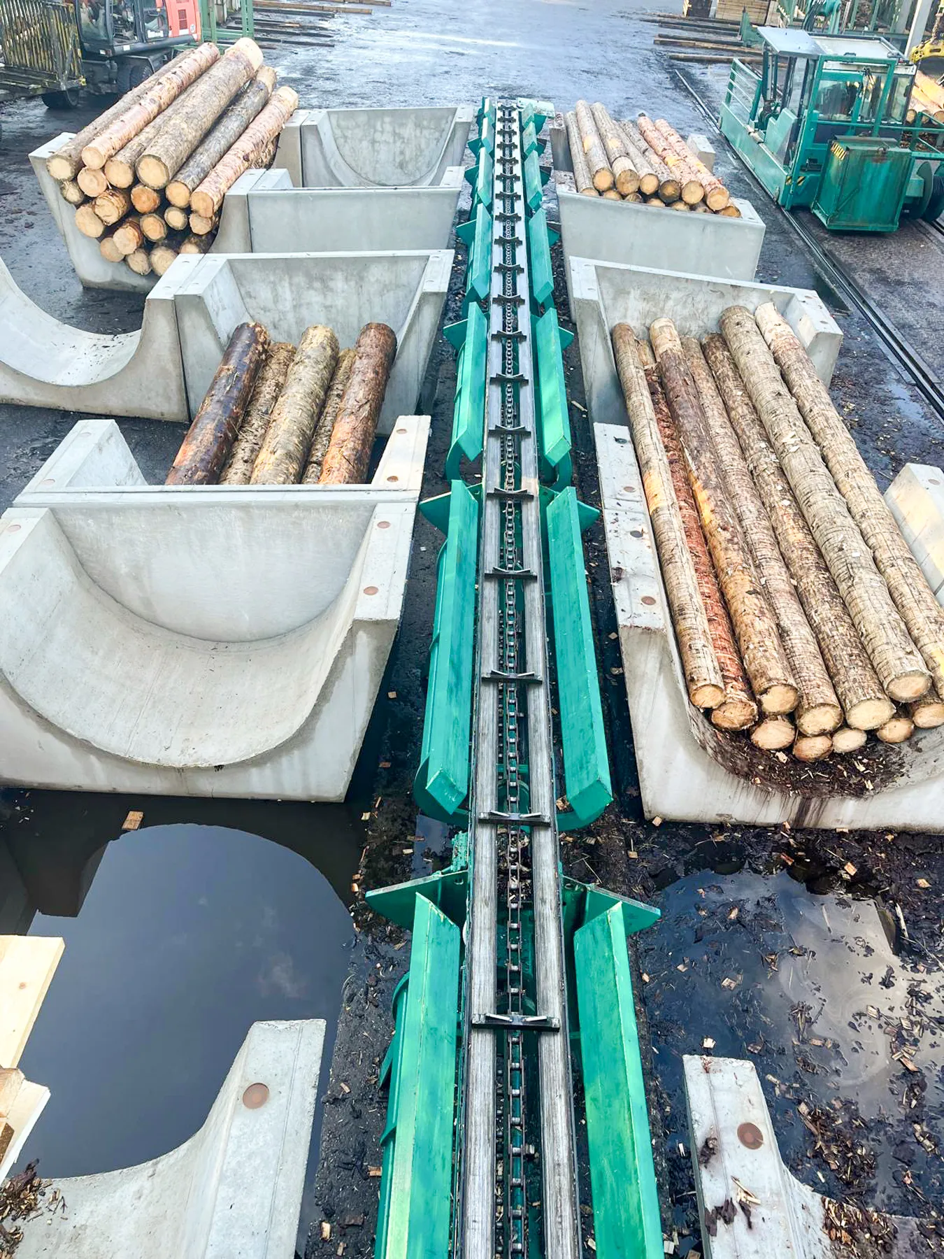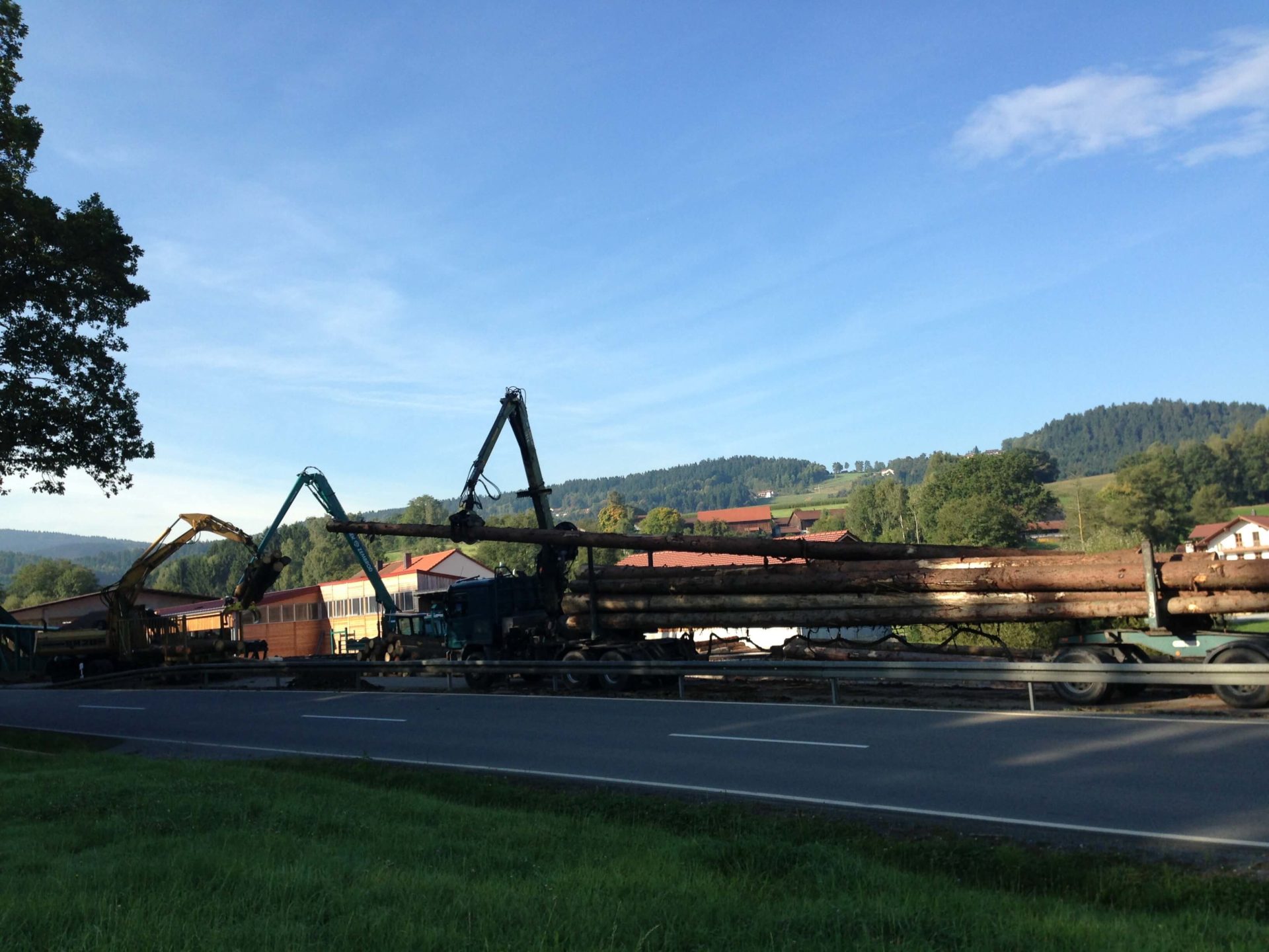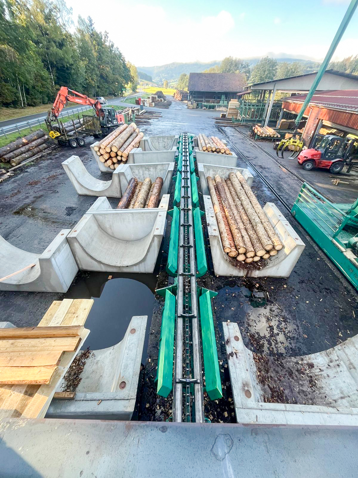 Das angelieferte Rundholz wird auf dem Platz entrindet, sortiert und der Wurzelstock event. reduziert. Dies erledigt ein Rundholzsortier- und -Transportwagen der Firma Baljer & Zembrod mit einer integrierten Vermessung und Klassifizierung.