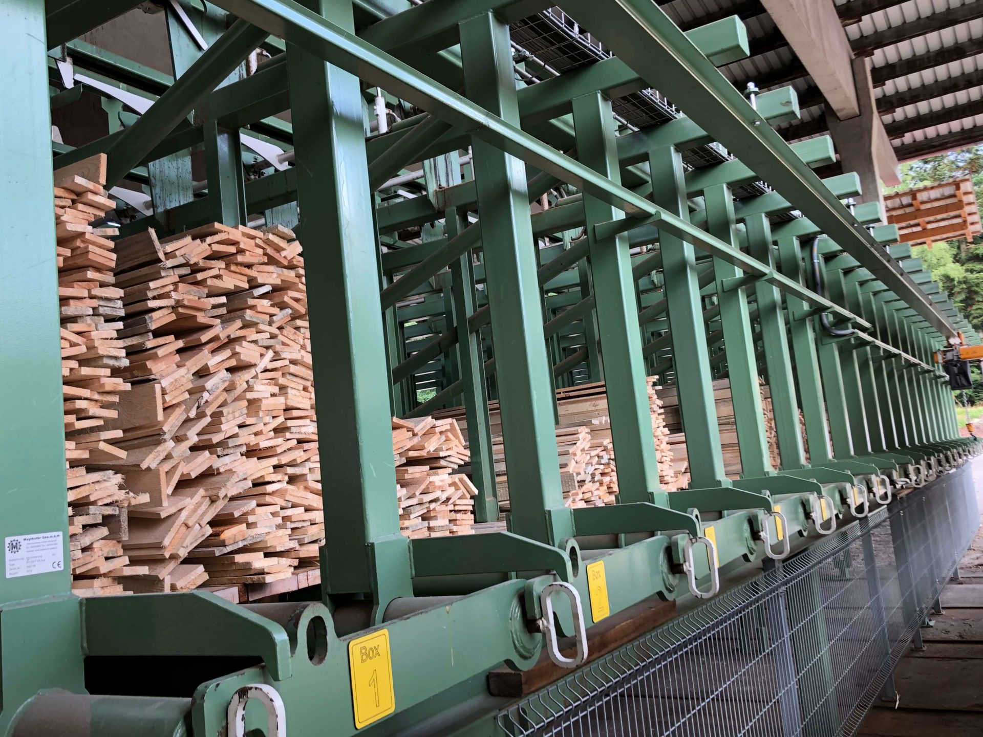 Mit der Schnittholzsortieranlage von der Firma Mayrhofer mit 22 Fallboxen besteht seit 2016 die Möglichkeit die Schnittwaren in Breiten, Stärken und Längen optimal zu sortieren. Nach der Schnittholzsortierung stapeln wir flexibel und kraftsparend die Schnittwaren mit der Stapelhilfe der Fa. Sicko.